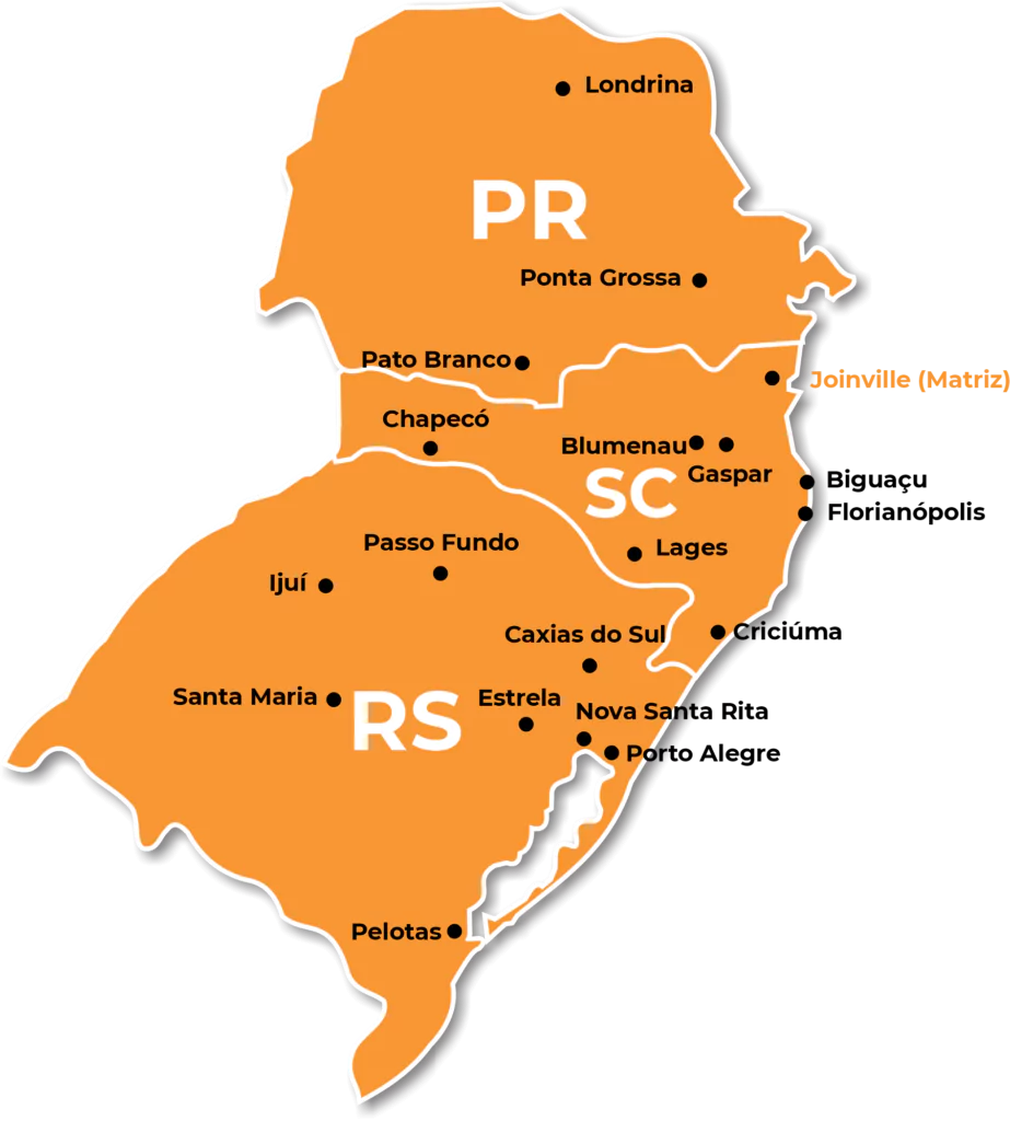 Com 26 unidades estrategicamente localizadas em todo o Sul do Brasil, estamos sempre ao seu lado, mas nossa atuação vai além dessa região. Oferecemos serviços de transporte e logística em todo o país, assegurando a qualidade e eficiência que você precisa, onde quer que esteja. Cada ponto no mapa, com várias unidades em alguns locais, reflete nosso compromisso em estar presentes onde você necessita, prontos para atender suas demandas com agilidade e precisão.